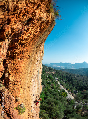 Fototapeta premium Girl climbs on the rock, rock climbing in Turkey, the sports girl is engaged in rock climbing.