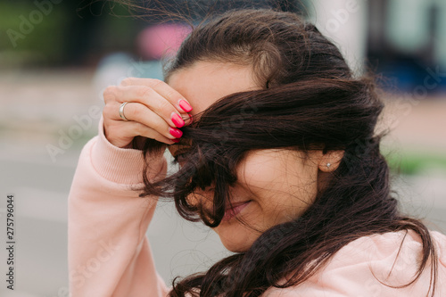 © Rychko Yevhen, Naklejka premium girl covers her face with hair and fooling around