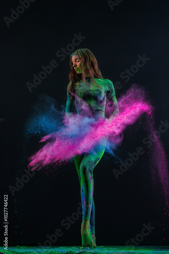 © st.kolesnikov, Obraz premium girl dancer in black suit dancing with explosions of colored paints holi on dark background
