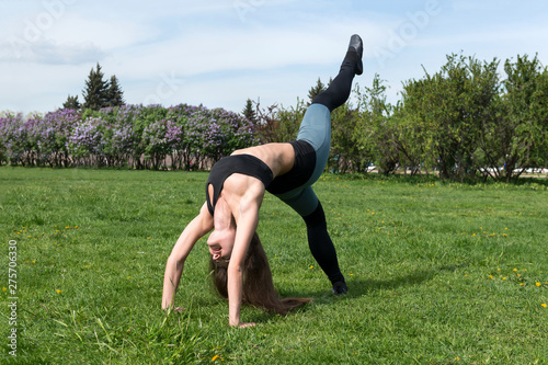 © Elena, Fototapeta premium girl doing bridge with raised leg, girl in sports clothes doing yoga on the grass in the Park