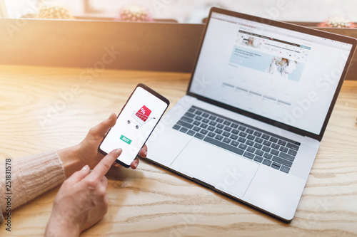 © VAKSMANV, Fototapeta premium Girl doing e-shopping. Online payment, Hands holding smartphone.
