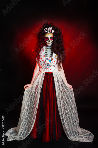 Fototapeta premium Girl dressed as a witch on Halloween ta dark red background