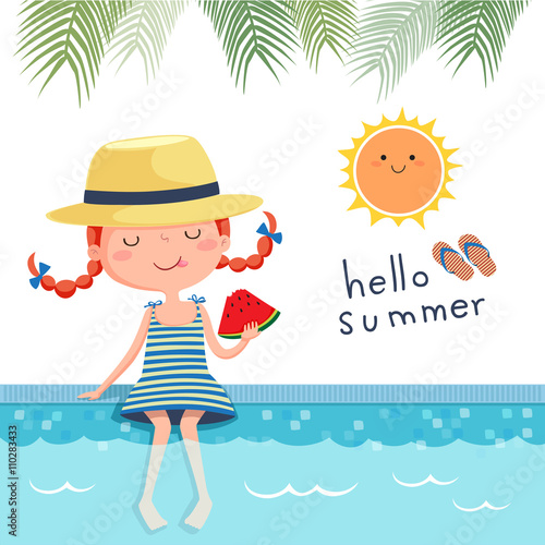 © kankhem, Fototapeta premium Girl eating watermelon at the pool