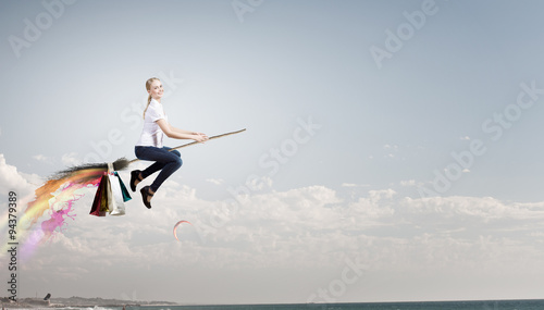 Naklejka premium Girl fly on broom