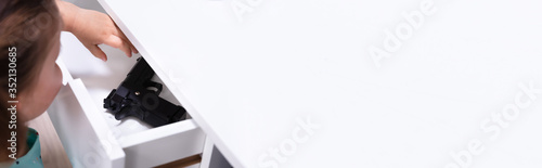 Fototapeta premium Girl Found Pistol In Drawer