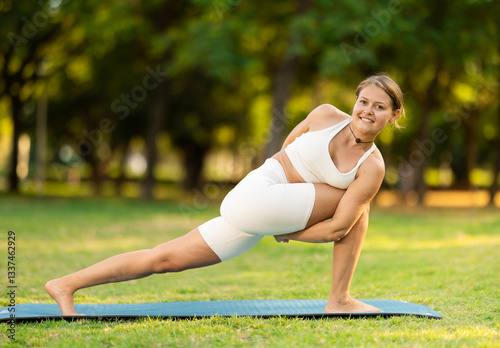 © JackF, Fototapeta premium Girl fulfill Parivritta Parshvakonasana during yoga workout in city park, on green lawn. Concept of balance, relaxation, physical health, longevity