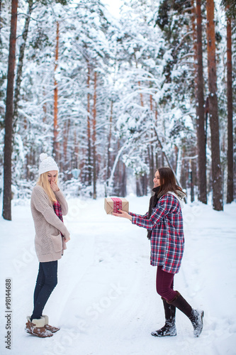 Naklejka premium girl gives her friend a Christmas gift in the winter snowy forest
