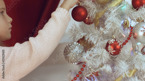 Naklejka premium Girl hangs Christmas balls at christmas tree