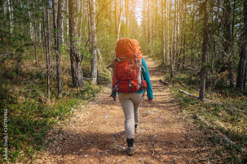 Fototapeta premium Girl hiker in the forest walking with backpacks in the sunset. The view from the back. Adventure travel, tourism, Hiking