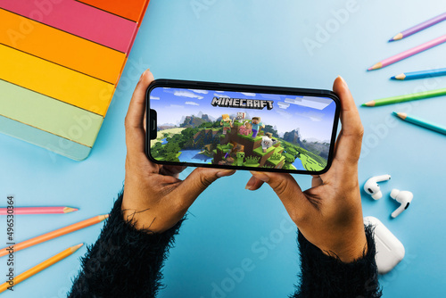 © Diego, Fototapeta premium Girl holding a smartphone with Minecraft mobile game app on the screen. Blue background with school supplies, AirPods, video game controller. Rio de Janeiro, RJ, Brazil. April 2022
