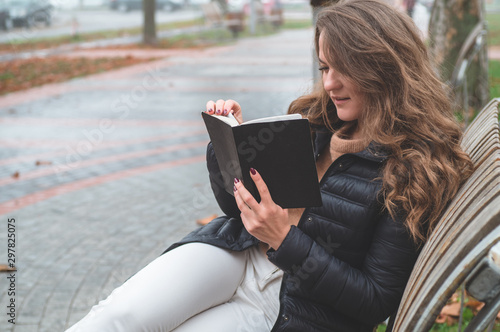 © Анастасія Стягайло, Obraz premium Girl holds book in her hands. The girl sitting on a bench, reading a book.