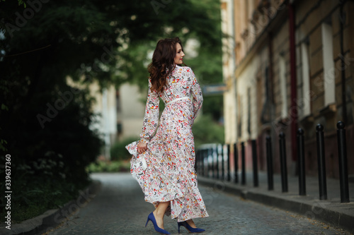 © ostap_davydiak, Naklejka premium Girl in a beautiful dress park in a flower