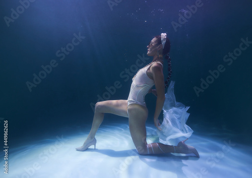 © Pavel Karchevskii, Fototapeta premium girl in a headdress at the bottom of the pool in the sun