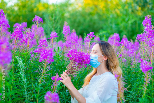 © Ermolaeva Olga, Fototapeta premium Girl in a medical mask sniffs a bouquet of flowers while walking in the park