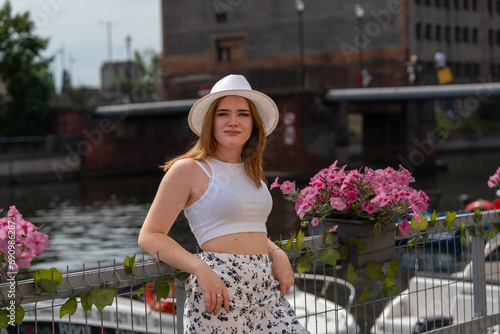 © Андрей Трубицын, Fototapeta premium girl in a white hat on the background of the city of Gdansk Poland Europe