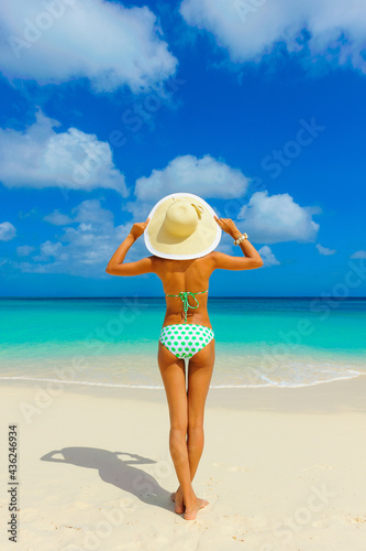 Fototapeta premium Girl in bikini having fun at the beach, standing on the beach with beach hat,...