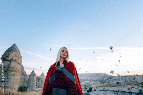 Naklejka premium girl in ethnic clothes at dawn watching the flight a lot of balloons fly over the valley of love