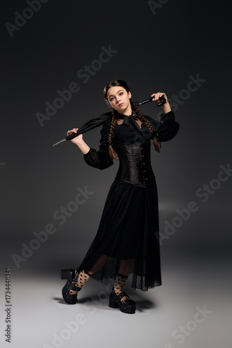 Fototapeta premium Girl in gothic dress paying homage to a classic spooky character for Halloween