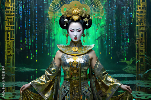 Fototapeta premium Girl in Japanese Attire by the Green Marsh.Generated by AI