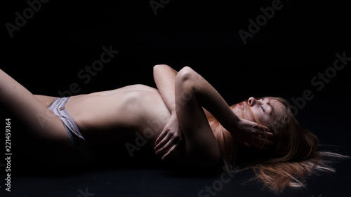 © евгений ставников, Obraz premium girl in lingerie lying on black background