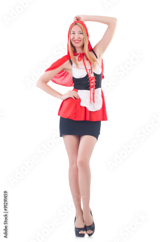 Fototapeta premium Girl in riding red hood costume isolated on white