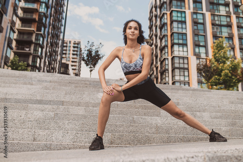 © Oleksandr, Fototapeta premium Girl in sportsear doing leg lunges and looking involved