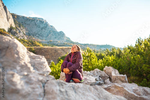 © zhukovvvlad, Naklejka premium Girl in the mountains.