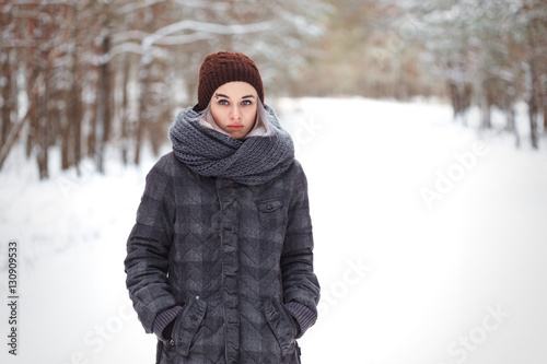 © makam1969, Obraz premium girl in the winter woods on a snowy road