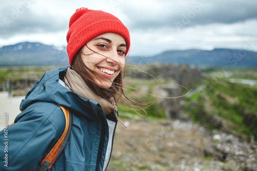 © vitaliymateha, Naklejka premium Girl in warm clothing observing surroundings on background of mountains of Iceland.