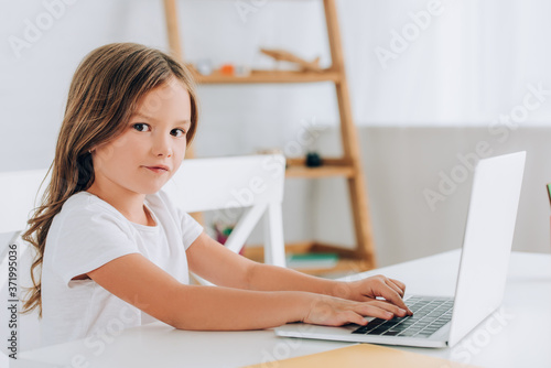Obraz premium girl in white t-shirt looking at camera while sitting at table and using laptop