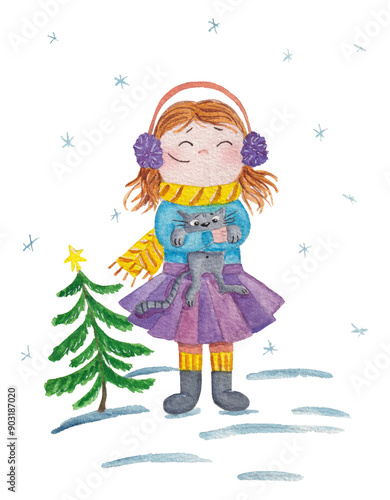 © Olga, Fototapeta premium Girl in yellow scarf hugging a grey cat. Winter scene. Christmas. Watercolour illustration