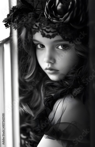 © Davy, Fototapeta premium girl is posing in her black dress, in the style of black and white contrast