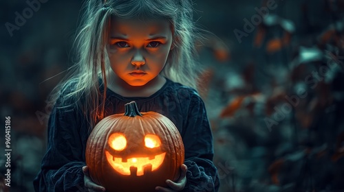 Naklejka premium girl kid with Sinister Expression Holding Glowing Pumpkin at Night
