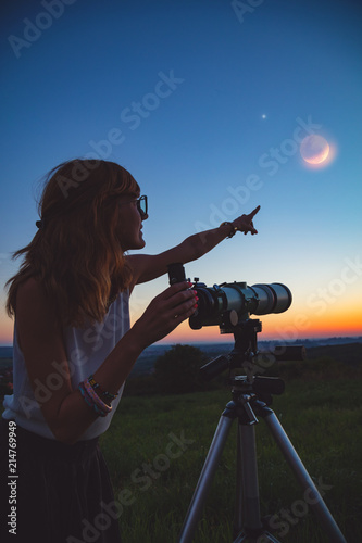 © astrosystem, Naklejka premium Girl looking at lunar eclipse through a telescope. My astronomy work.