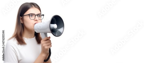 Naklejka premium Girl megaphone speak banner. Person fun loud articulate palm. Generate Ai