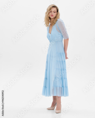 © Streetstylephoto, Naklejka premium Girl model in blue dress on white studio background.