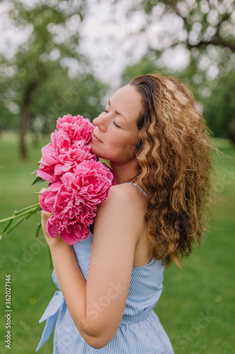 Fototapeta premium girl model mother holding peonies and flowers in her dress gently presses them to herself on the nature in the park