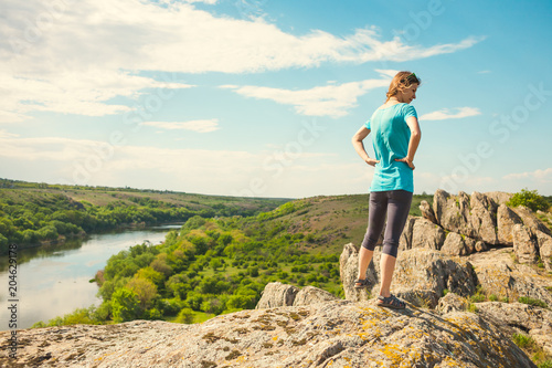 © zhukovvvlad, Naklejka premium girl on top of the mountain