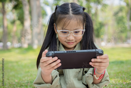© littlepigpower, Fototapeta premium Girl playing video game with handheld game console at garden