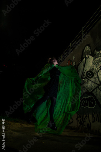 © prod 2BEREGA, Naklejka premium Girl posing in green draping on dark background