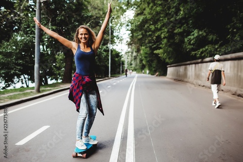 © alexzhilkin, Fototapeta premium girl posing with skate board