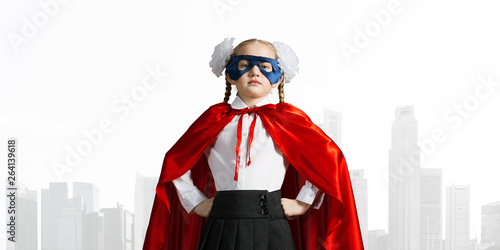 © adam121, Obraz premium Girl power concept with cute kid guardian against cityscape background