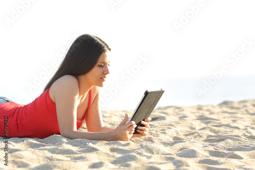 Fototapeta premium Girl reading an ebook or tablet on the beach