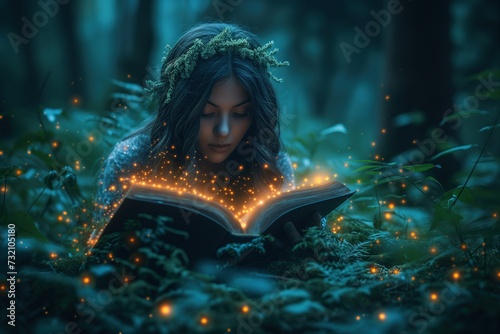 Fototapeta premium Girl Reading Magical Book in the Forest with Yellow Fairy Dust