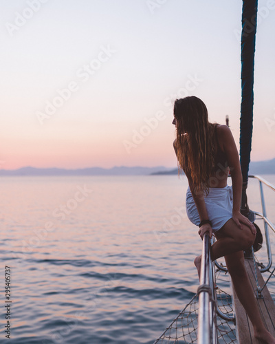 © Dylan Alcock, Obraz premium Girl relaxing on the side of a yacht watching the sunset in the distance, thinking about life. Shot in antalya coastline, Turkey.