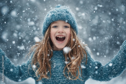 Naklejka premium Girl's Delight: First Snowfall Excitement in Winter Wear