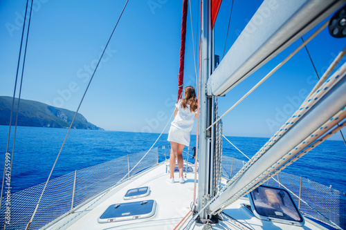 Fototapeta premium Girl Sailing On Yacht in Greece