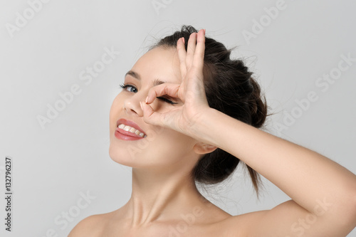 © alexshalamov, Fototapeta premium Girl shows a sign all ok and smiles