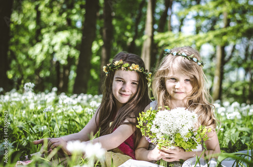 © katarinagondova, Naklejka premium girl sitting in spring meadow
