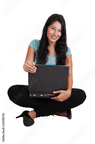 © 80Feierabend, Naklejka premium Girl sitting with laptop on floor.